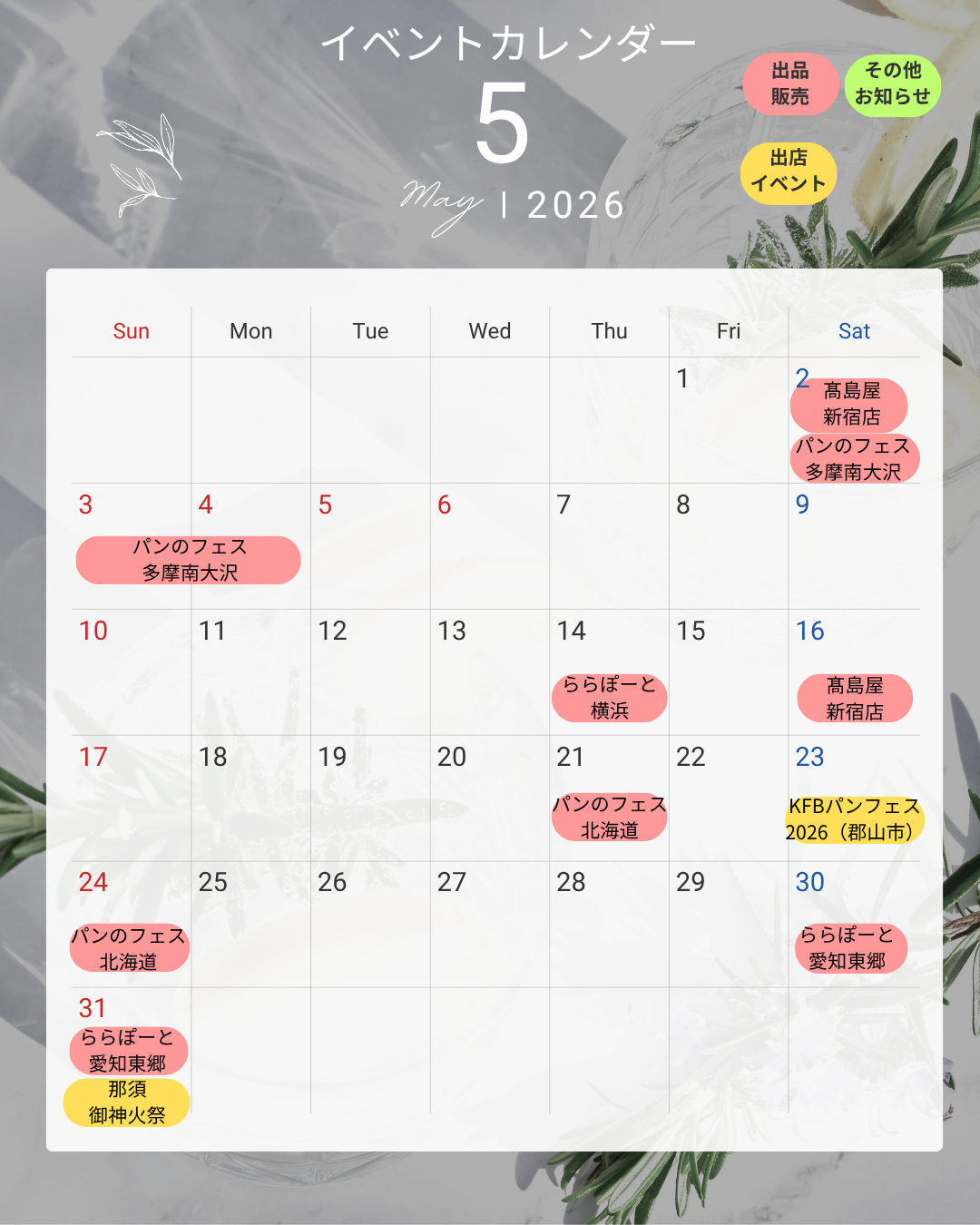 下記日程はベーカリー、レストラン共に休業とさせていただきます。